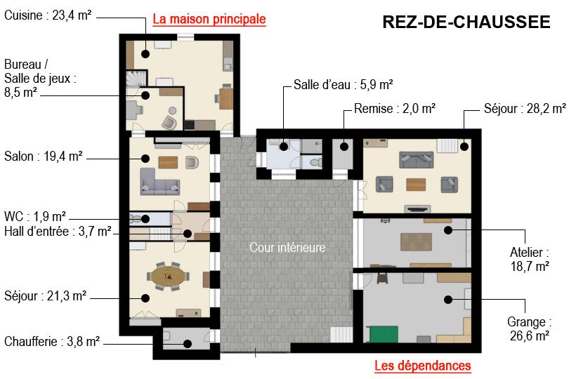 Surface habitable totale de la propriété : 171,0 m² (Hors chaufferie, atelier, grange et cave) Toutes les mesures indiquées ci-dessous sont calculées intra-muros |
